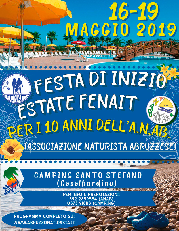Questo eccezionale evento si svolgerà dal 16 al 19 maggio 2019, all’interno del prestigioso Villaggio Camping Santo Stefano di Casalbordino, il quale sarà per l’occasione completamente adibito alla pratica naturista. L’ingresso sarà riservato, come da prassi, a tutti gli iscritti alle associazioni FENAIT e a quelle facenti parte di altre Federazioni estere membri della International Naturist Federation (INF).