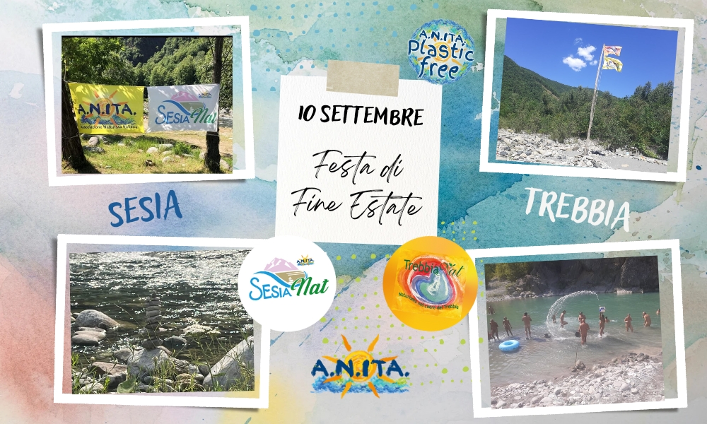 A.N.ITA. invita tutti i naturisti soci e non, a festeggiare la chiusura dell’estate domenica 10 settembre alla spiaggia del Secchiello Selvaggio lungo il fiume Trebbia alle Anse di Brugnello con Tebbianat e alla spiaggia della Balangera a Varallo in Val Sesia insieme a Sesianat.