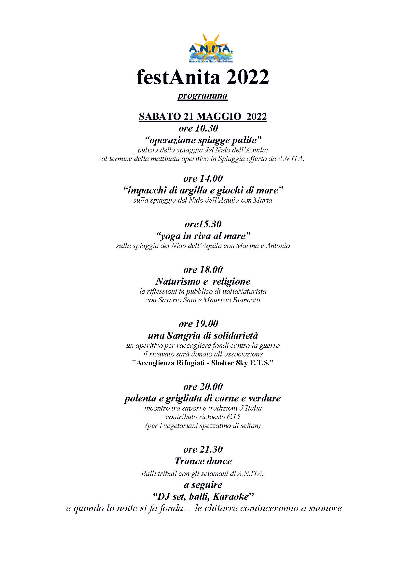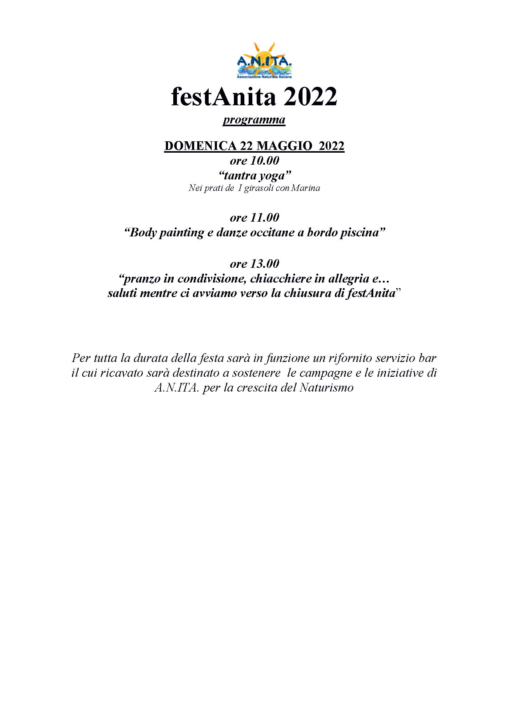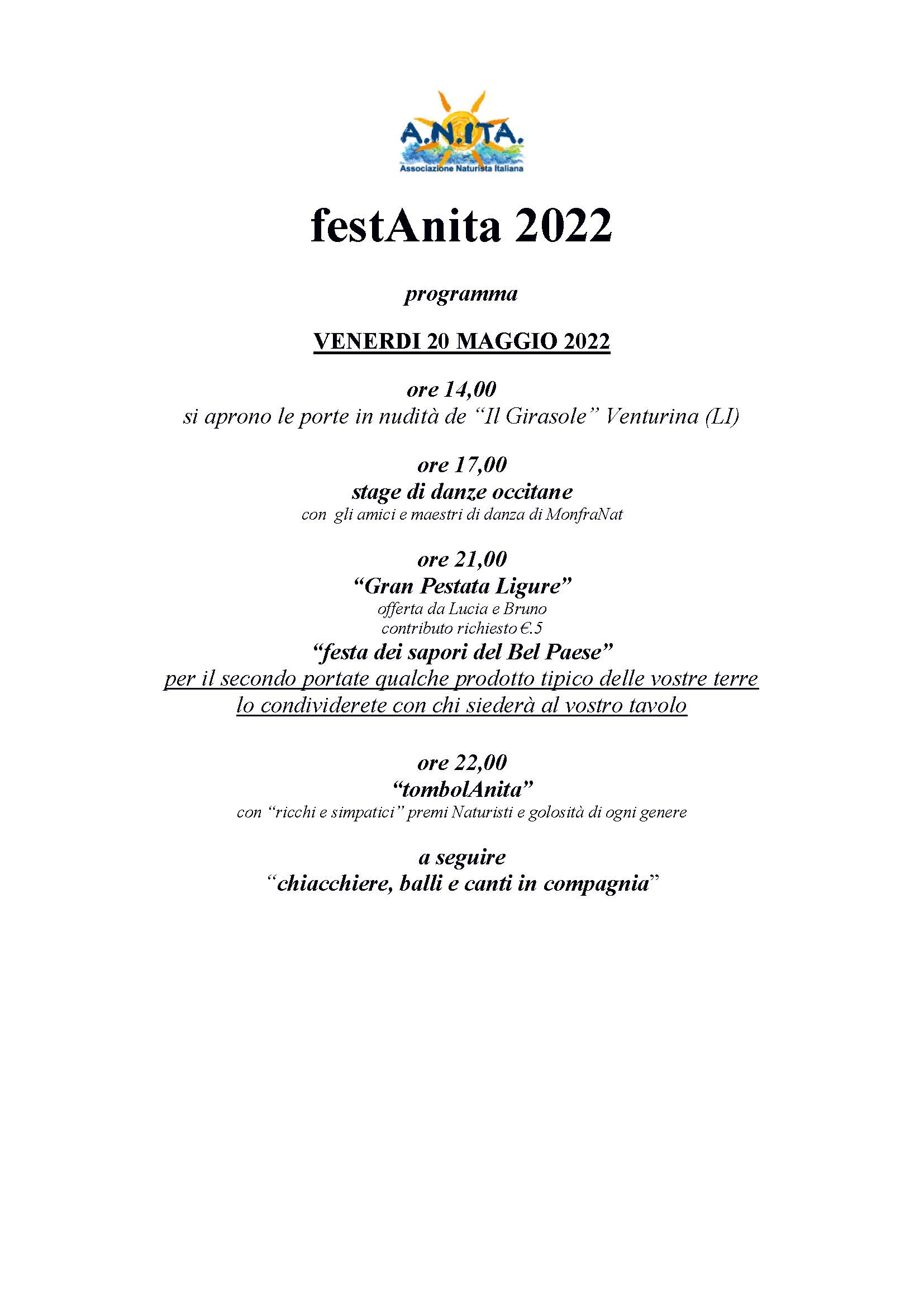 Per la tre giorni di FestAnita l’intero agriturismo sarà riservato alla nostra associazione e pertanto potremo stare tre giorni in nudità.