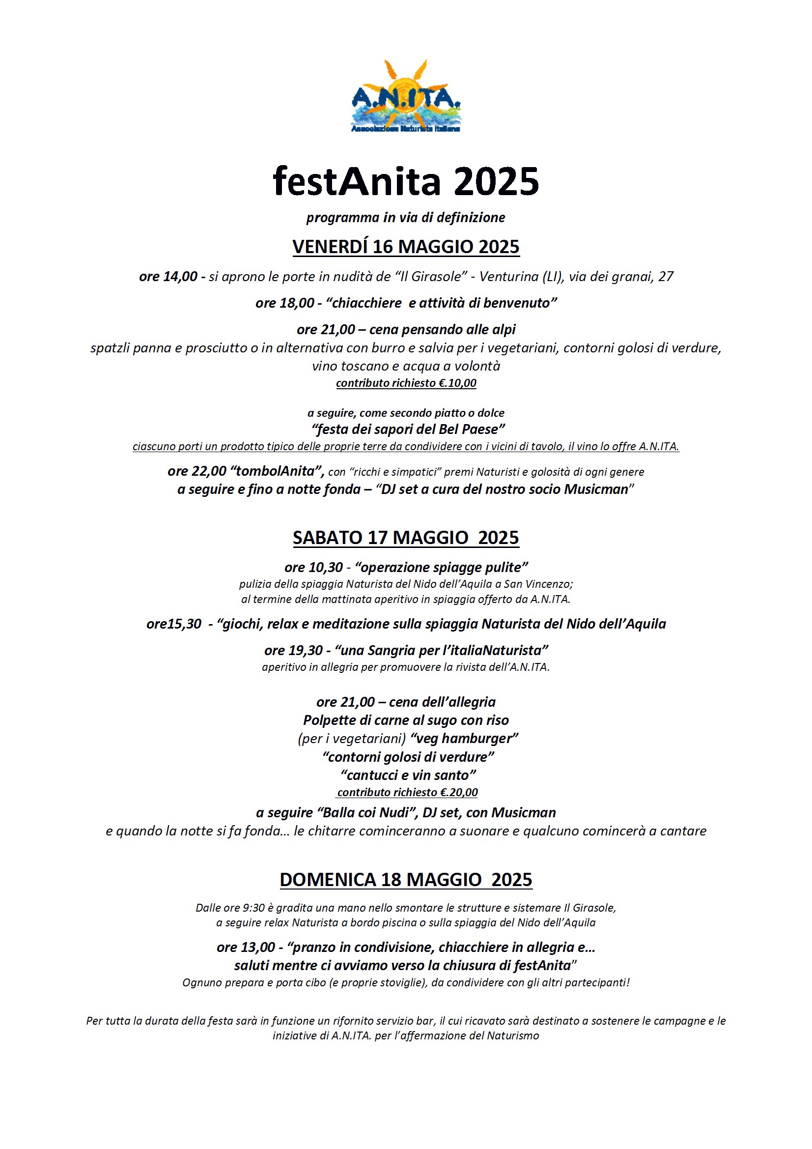 Ogni partecipante avrà la possibilità di prepararsi la colazione e dovrà provvedervi (portando il dovuto). A.N.ITA. penserà invece alla cena del venerdì e del sabato per le quali vi rimandiamo all’allegato programma della festa.