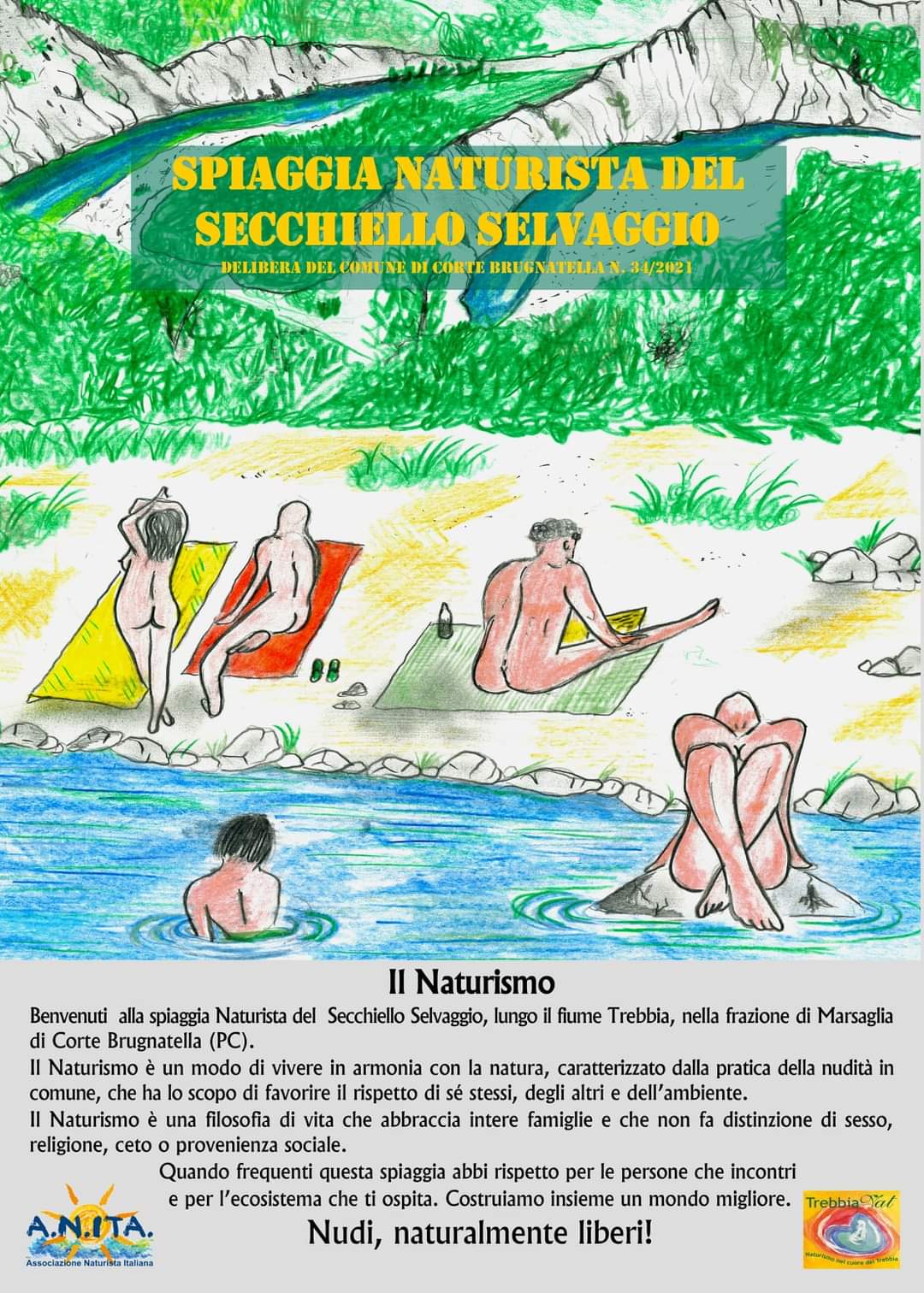 Il 23 giugno 2021, la Giunta del Comune di Corte Brugnatella, nella persona del Sindaco Mauro Guarnieri ha firmato la Delibera n°34 che autorizza la pratica del naturismo nel tratto di spiaggia denominato "Secchiello Selvaggio".